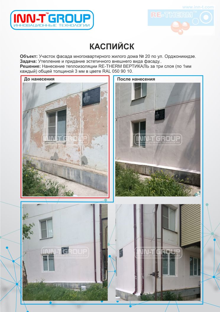 Очередным необычным объектом применения стал участок фасада жилого дома в Каспийске. На фасаде дома №20 по улице Орджоникидзе прежняя цветовая гамма сохранилась в точности, а внешний слой обновился, увеличившись всего на три миллиметра. Кроме того, еще одним немаловажным преимуществом является то, что в отличие от «классического» утепления жидкая теплоизоляция RE-THERM не увеличивает пожароопасность фасада.