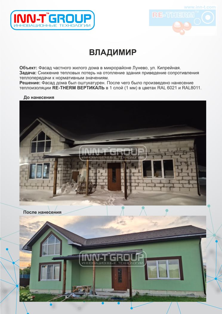 Во Владимире был выполнен совсем небольшой, но примечательный проект, наглядно демонстрирующий эффективность материалов производства INN-T GROUP. Речь идет об утеплении фасада дома стены которого были выполнены из газобетона. Для данного проекта был применен инновационный сверхтонкий теплоизолятор RE-THERM. Этот материал, что существенно, изначально создавался для решения задач космической отрасли, но теперь находит применение и в гражданском строительстве.