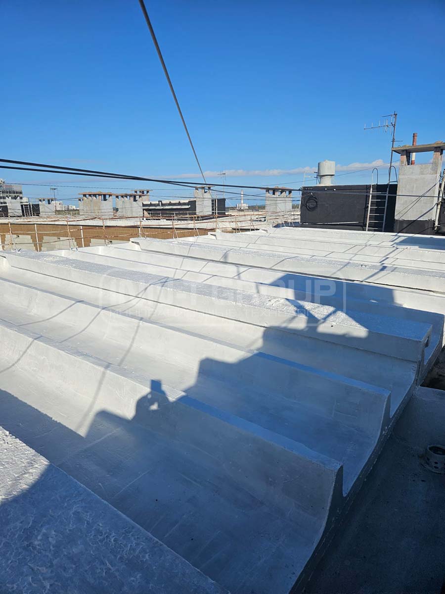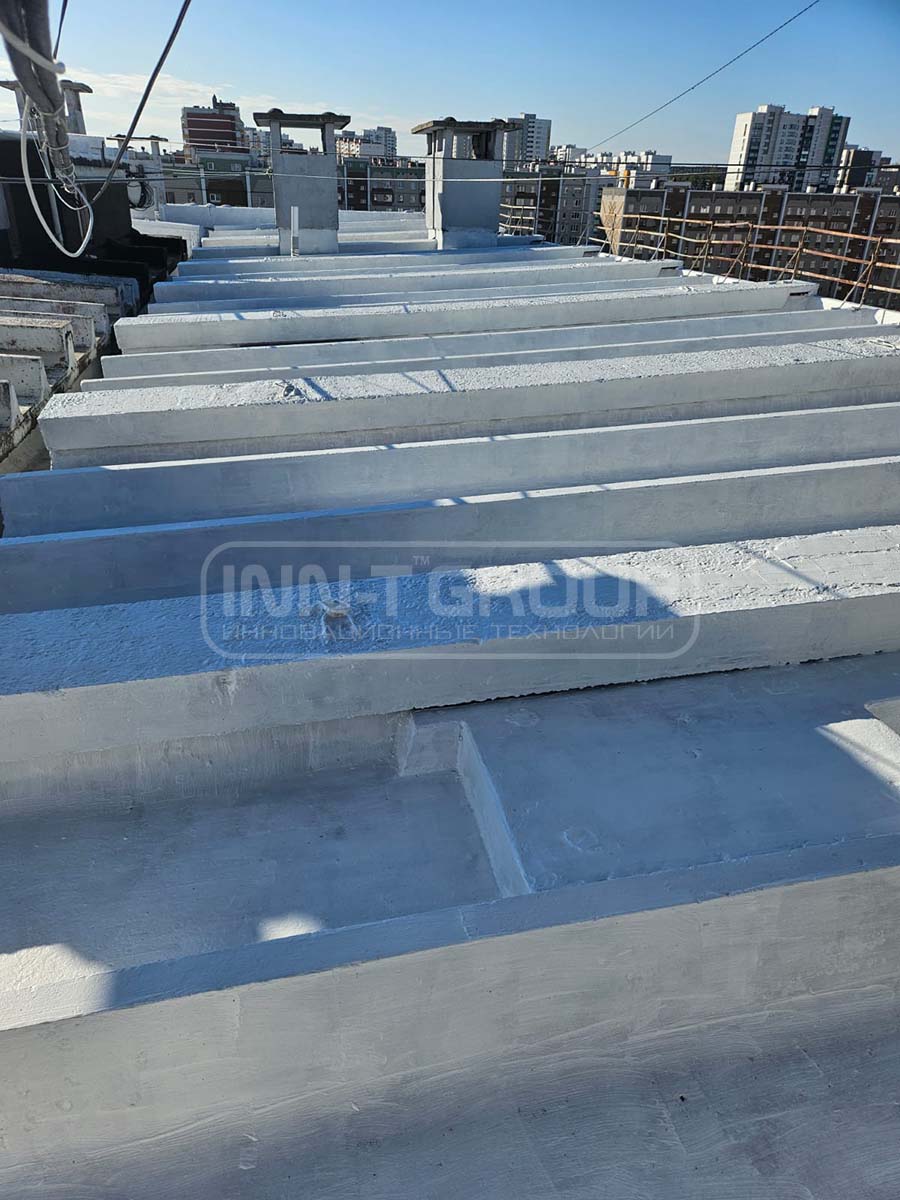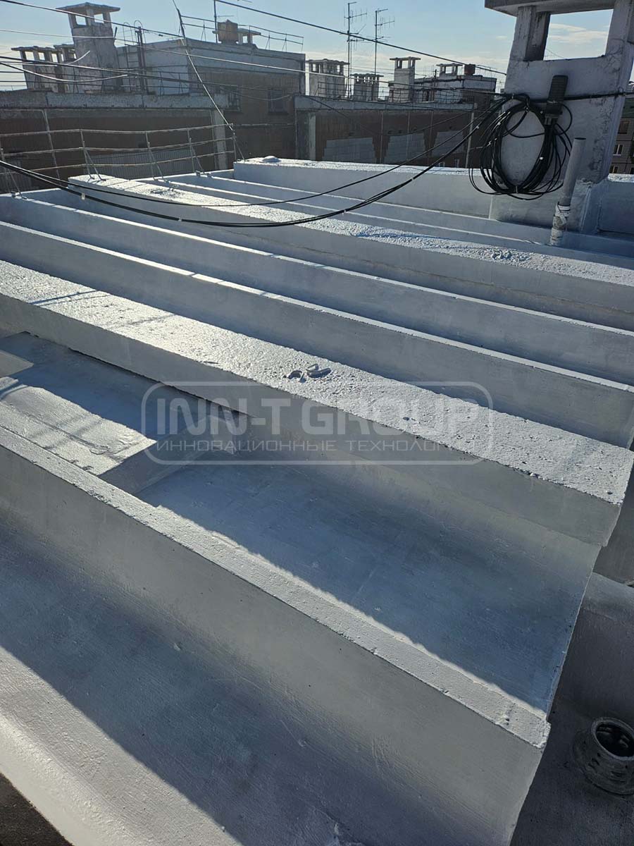 Решение: На плиты было нанесено гидроизоляционное полимерное покрытие R-COMPOSIT в 4 рабочих слоя при помощи малярных кистей. Перед нанесением поверхность была загрунтована в один слой покрытием R-COMPOSIT разбавленным водой согласно инструкции.